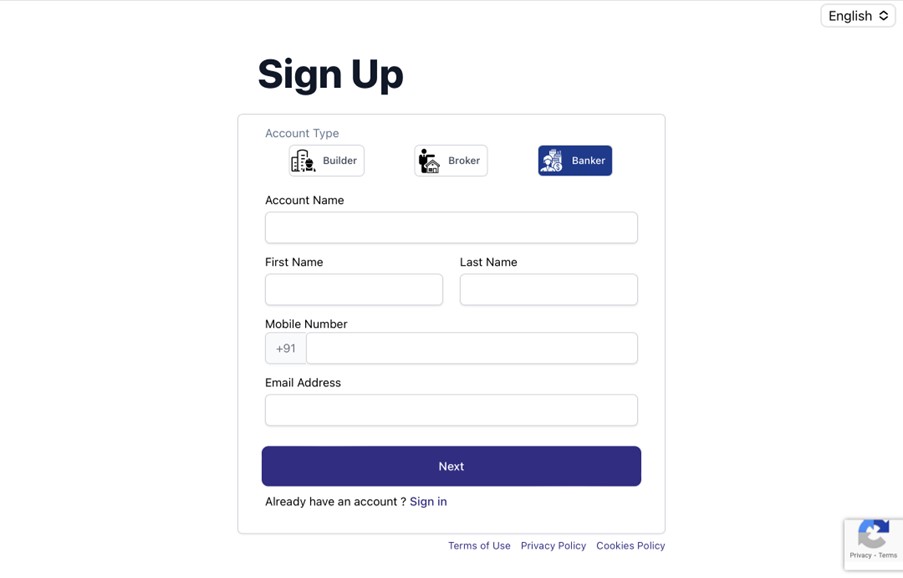 - Account Type: Select any one category that is most relevant to your work profile or company, as a Builder, Broker or a Banker.